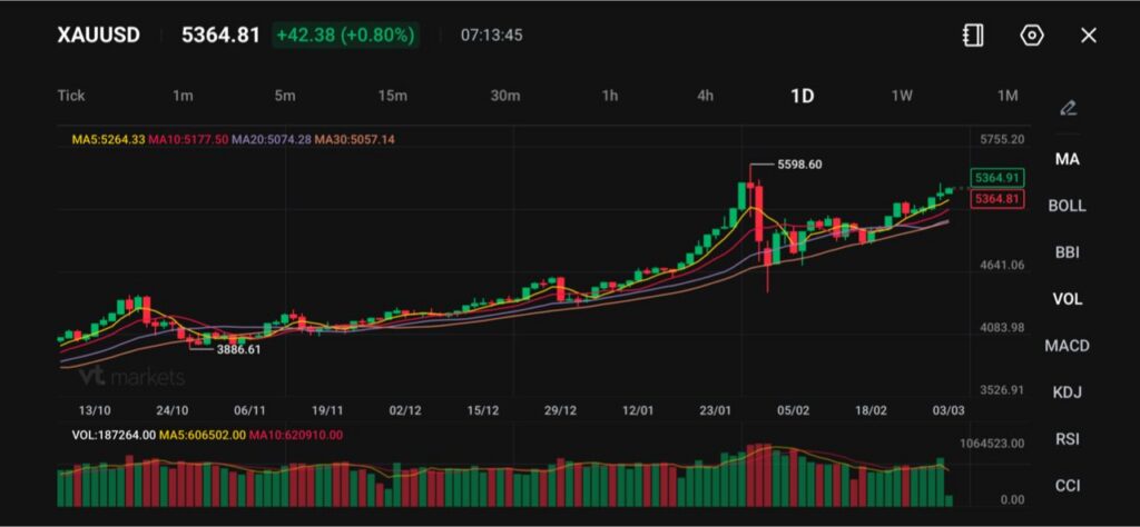طلا (XAUUSD: نماد معامله طلا در برابر دلار آمریکا) نزدیک ۵,۳۶۵ معامله میشود و در این جلسه حدود ۰.۸٪ رشد کرده است؛ در حالی که به سمت سقف قبلی ۵,۵۹۸.۶۰ حرکت میکند. ساختار کلی روزانه همچنان صعودی است؛ قیمت از اصلاح فوریه (Pullback: افت موقت در روند) تا امروز، پیدرپی سقفهای بالاتر و کفهای بالاتر ساخته است.