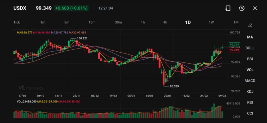 شاخص دلار آمریکا (USDX) نزدیک 99.35 معامله میشود و حدود 0.61% رشد کرده است. دلار بعد از برگشت از کف اواخر ژانویه نزدیک 95.34 قویتر شده است. این شاخص در چند جلسه اخیر آرام و پیوسته بالا آمده و نشان میدهد بعد از یک دوره ضعف، دوباره تقاضا برای دلار بیشتر شده است.