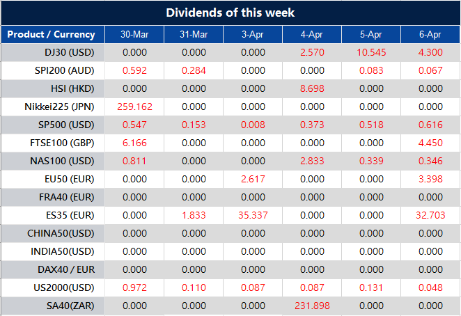 Please note that the dividends of the following products will be adjusted accordingly. Index dividends will be executed separately through a balance statement directly to your trading account, and the comment will be in the following format “Div & Product Name & Net Volume ”.