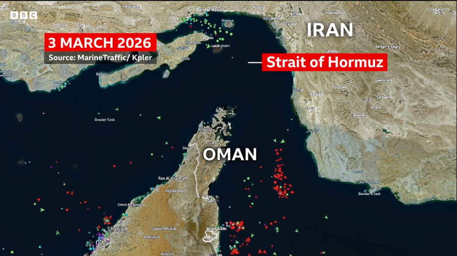 نقشه ماهوارهای نشاندهنده تراکم کشتیها در تنگه هرمز در ۲۷ فوریه ۲۰۲۶ در مقایسه با ۳ مارس ۲۰۲۶، با تأکید بر این گلوگاه راهبردی دریایی