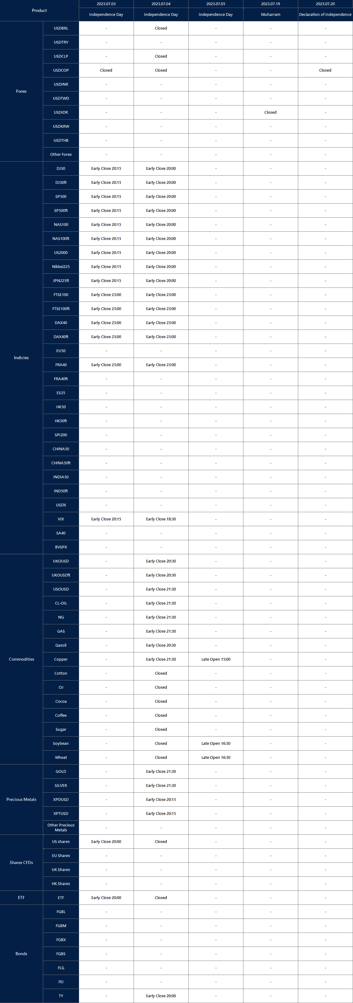 Please note that the following instruments’ trading hours will be affected by the upcoming holidays.