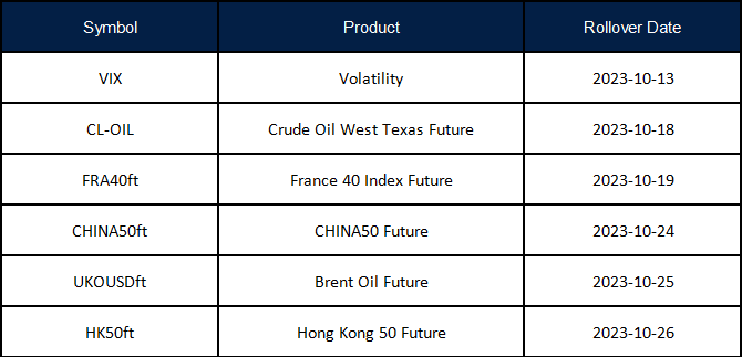 • Positions that are open on the expiration date will be adjusted via a rollover charge or credit to reflect the price difference between the expiring and new contracts.